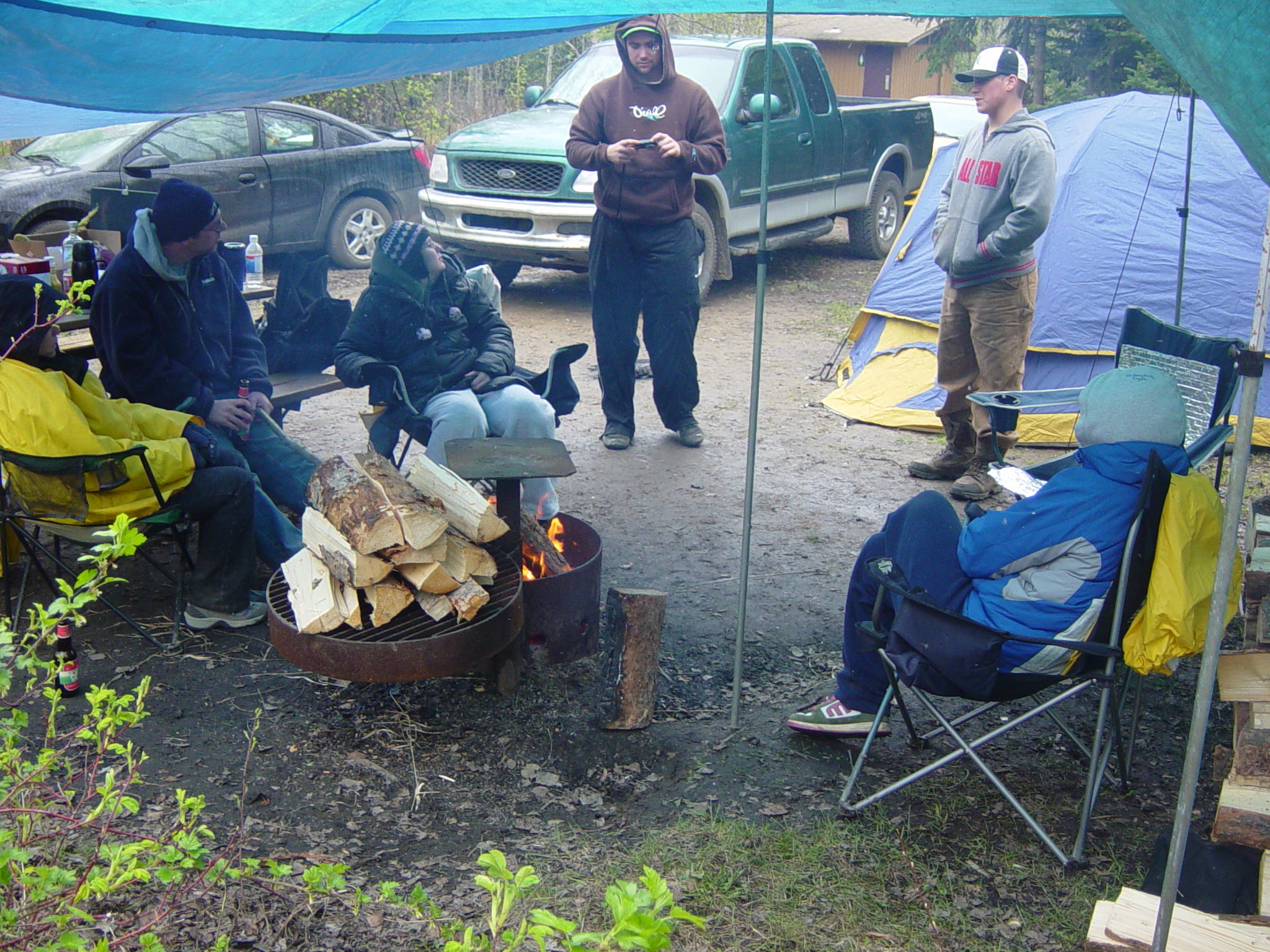 The young'uns site - after an awesome tarp job: Karen, Scott, Mel, Kent, Trevor, Jess.